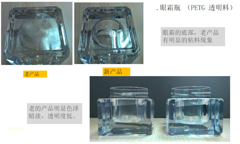 6、试模对比总结:外观效果对比如图3所示。产品外观质量显著提高,主要表现在透明度显著提高,侧面缩痕显著改善,底部平整度显著提高,进胶口处平整且没有拉丝现象。