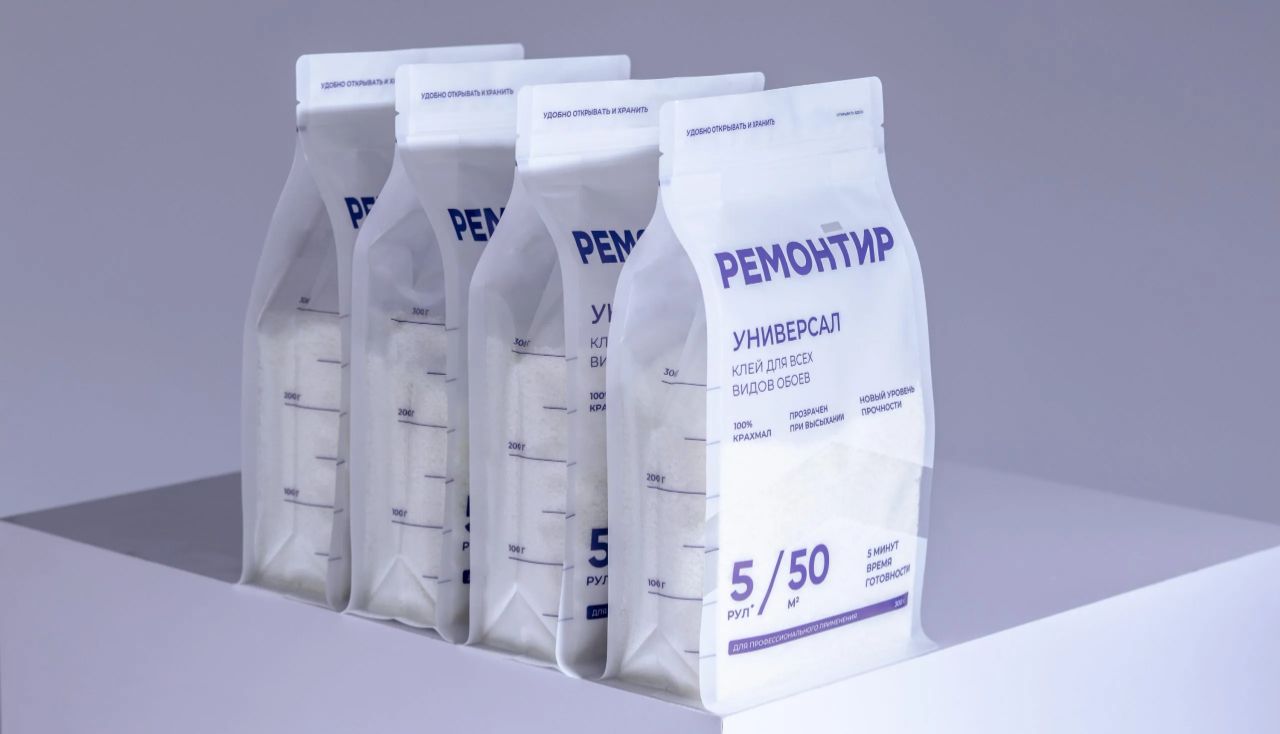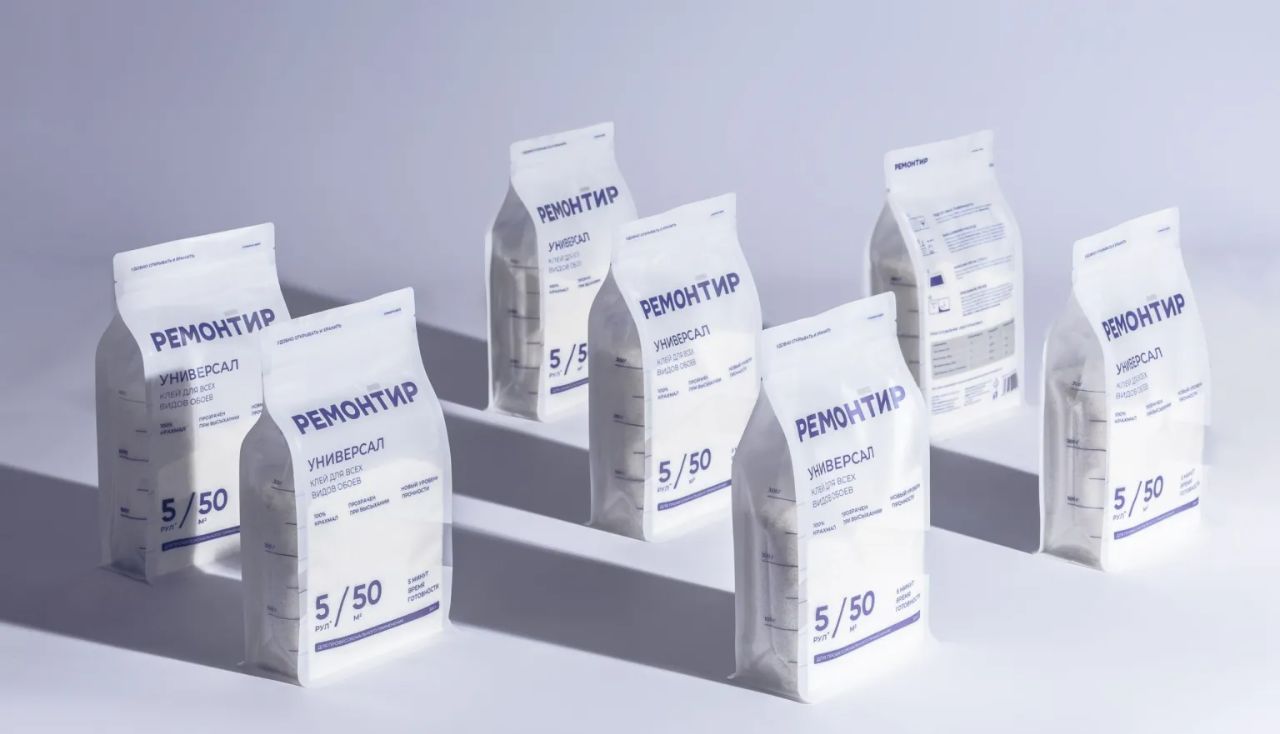 为了将上述两大优势有效传达给消费者,“Remontir”品牌在设计墙纸胶包装时采用了简约的设计风格。简约设计不仅符合现代家居的审美趋势,更能够凸显产品的核心优势。