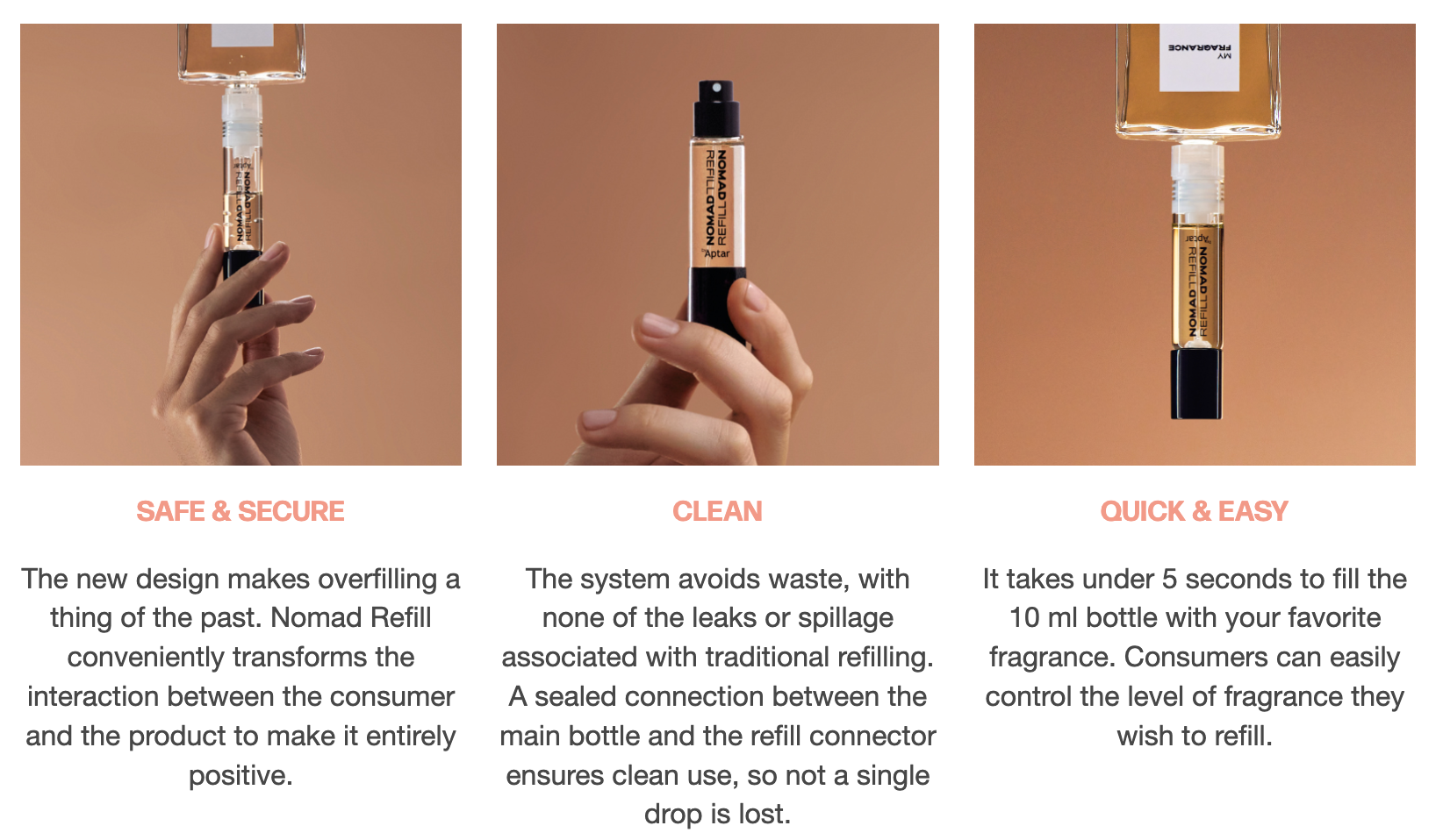 借助 Nomad Refill,Aptar Beauty 推出了一项新技术,可增强居家补香体验,同时提供定制选项,以增强品牌价值并提高产品吸引力。消费者首次可以随身携带自己喜欢的香水,并轻松补香,这样他们就可以在一天中尽情享受补香的乐趣。这项新解决方案旨在满足消费者对迷你香水和补香解决方案市场两位数销售增长的需求。这也是品牌通过新需求扩展其产品线的新机会,从而促进香水消费。