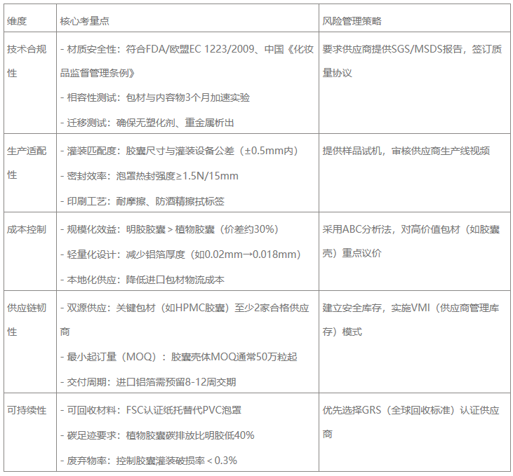 胶囊包材采购需以内容物稳定性为第一原则,避免因追求低成本牺牲产品功效。同步布局可持续包材创新(如水溶性胶囊膜),应对全球环保法规升级。实际采购中建议联合研发、品质部门建立《包材技术标准手册》,明确检测项目(如胶囊溶解时间、铝箔针孔率),实现全链路标准化管理。
