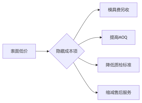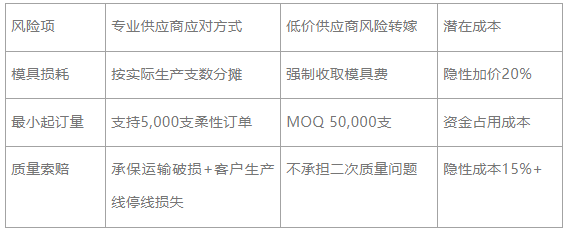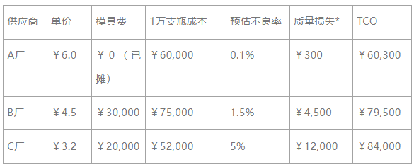公式:TCO = (单价 + 模具分摊) × 订单量 + 质量损失成本 + 物流仓储成本