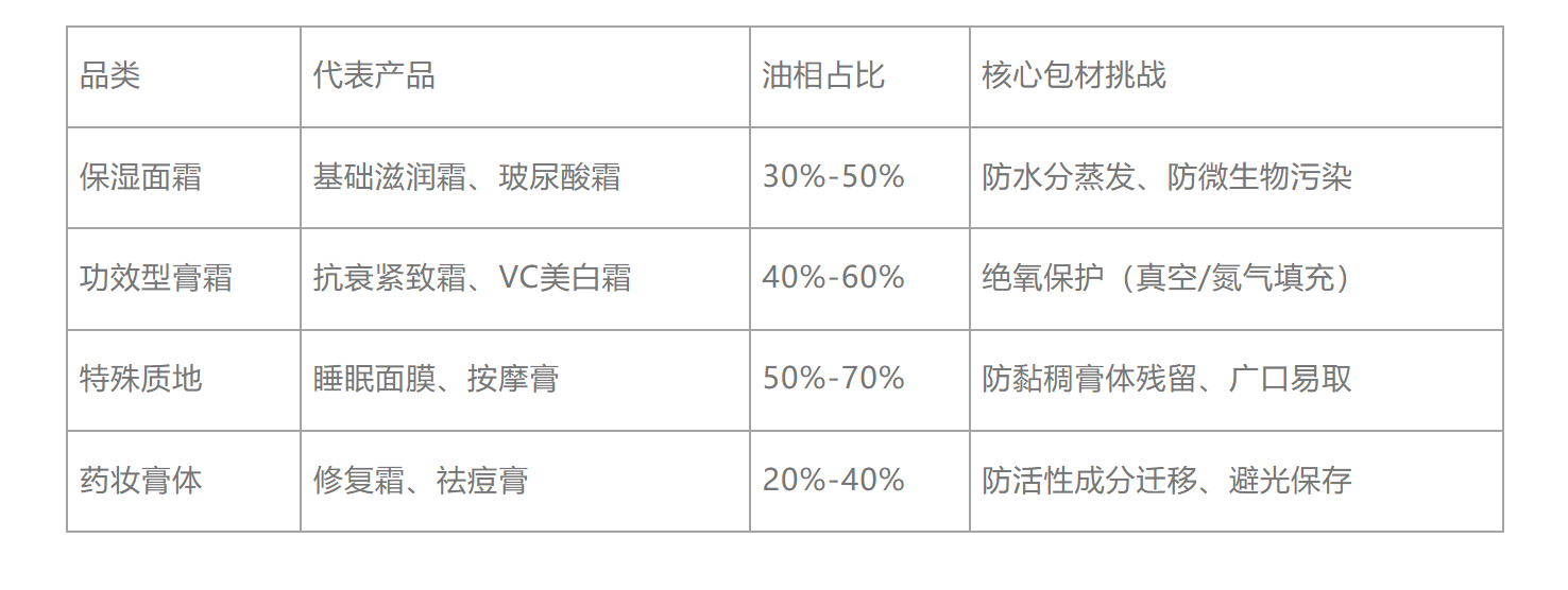 膏霜为高稠度半固体乳化体系,含油相比例显著高于乳液(通常>30%),特征包括:
